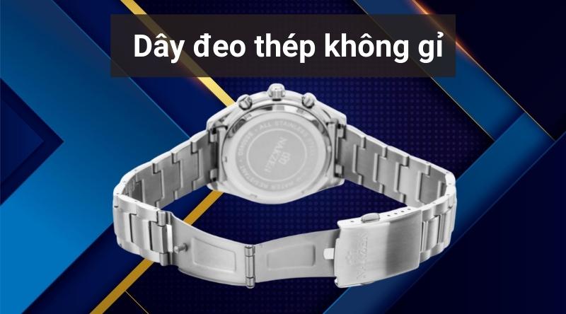 - Thép không gỉ chính là chất liệu được sử dụng để làm dây đeo và khung viền của đồng hồ, chất liệu có độ cứng cao, bền bỉ, có khả năng chống ăn mòn tốt, chống oxi hoá, chống chịu mọi thời tiết.