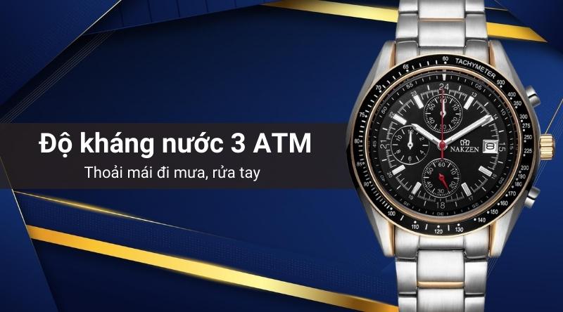- Khả năng chống nước của mẫu đồng hồ nam này là 3 ATM, người dùng hoàn toàn có thể sử dụng khi đi mưa, rửa tay. Không nên sử dụng khi đi tắm, đi bơi hay lặn.