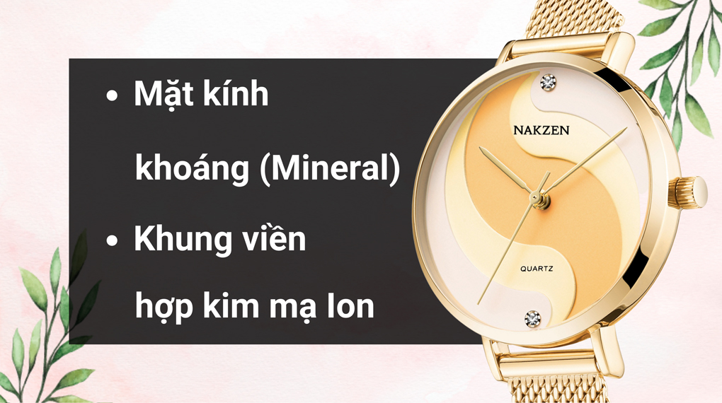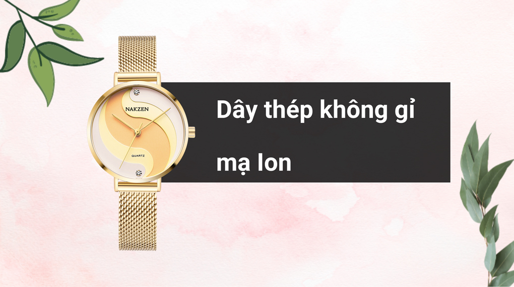 • Khung viền của chiếc đồng hồ nữ này được chế tạo từ hợp kim mạ Ion - một loại chất liệu vừa nhẹ nhàng vừa đáng tin cậy về độ bền theo thời gian. Chất liệu này không chỉ mang lại sự nhẹ nhàng cho đồng hồ, mà còn đảm bảo độ ổn định và tính bền lâu dài. Hơn nữa, dây đeo làm từ thép không gỉ mạ Ion, chất liệu có độ cứng tốt và khả năng chống va đập, mang lại sự an tâm cho việc đeo sản phẩm ở mọi hoàn cảnh.