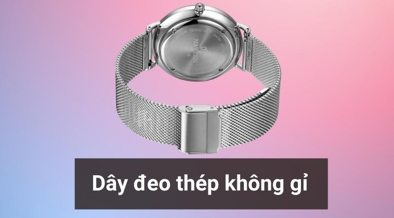 - Thép không gỉ chính là chất liệu được sử dụng để làm dây đeo và khung viền của đồng hồ, chất liệu có độ cứng cao, bền bỉ, có khả năng chống ăn mòn tốt, chống oxi hoá, chống chịu mọi thời tiết.