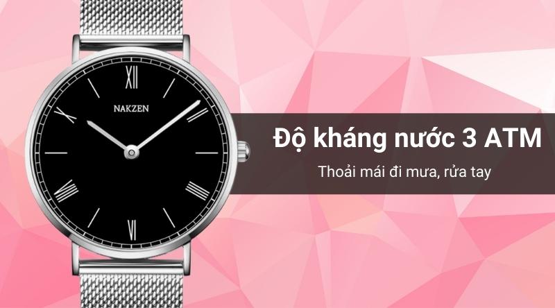 - 3 ATM là độ kháng nước của chiếc đồng hồ nam này, người dùng có thể an toàn đeo khi đi mưa, rửa tay. Lưu ý: không nên mang khi đi tắm, bơi hay lặn.