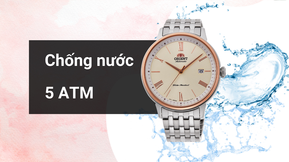 • 5 ATM là hệ số kháng nước của chiếc đồng hồ Orient này, vì thế các chàng trai có thể yên tâm sử dụng trong các hoạt động hằng ngày như rửa tay, đi mưa hay đi tắm. Lưu ý: không đeo khi đi bơi hay đi lặn.