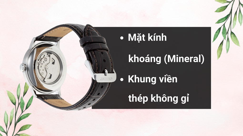 • Thiết kế có kích thước mặt 40.5 mm phù hợp với các chàng trai có cổ tay trung bình. Kính khoáng là chất liệu mà hãng lựa chọn cho mẫu đồng hồ Orient này, kính ít bị trầy xước nếu va quẹt không quá mạnh. Ngoài ra, kính khoáng cũng có thể đánh bóng nếu trầy, điều này giúp các chàng trai có thể đeo lâu dài.