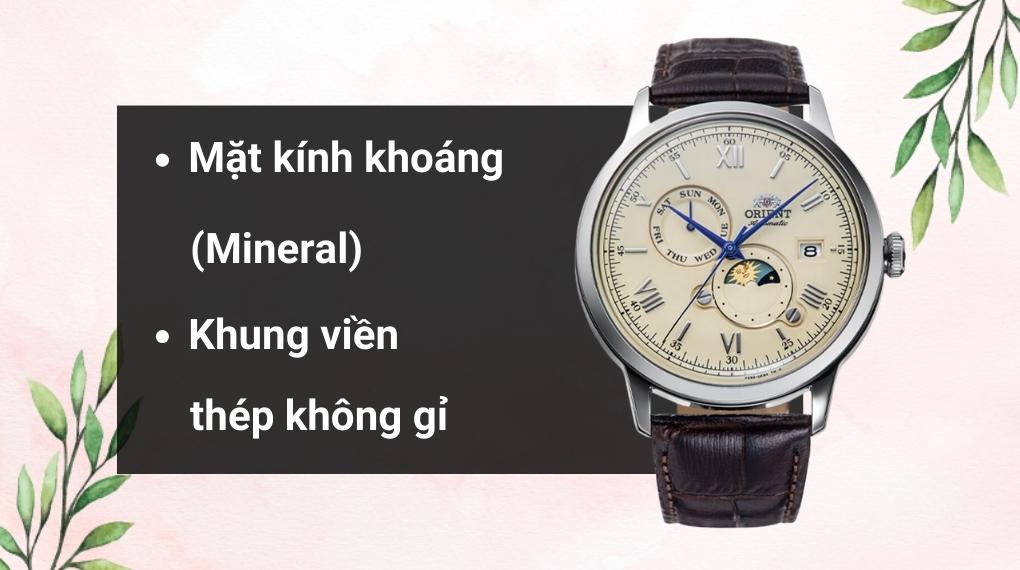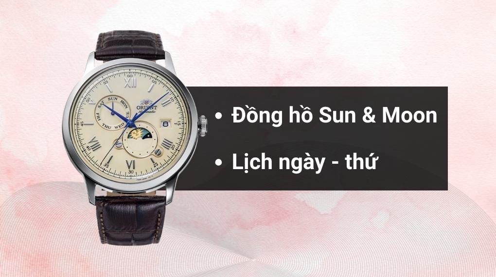 • Trên mặt đồng hồ Orient này còn được hãng tích hợp các tiện ích như đồng hồ Sun & Moon nằm ở vị trí 5 giờ, lịch ngày - thứ nằm ở vị trí 3 giờ và 10 giờ giúp tăng khả năng quản lý thời gian của người dùng cũng như tính thẩm mỹ của sản phẩm.
