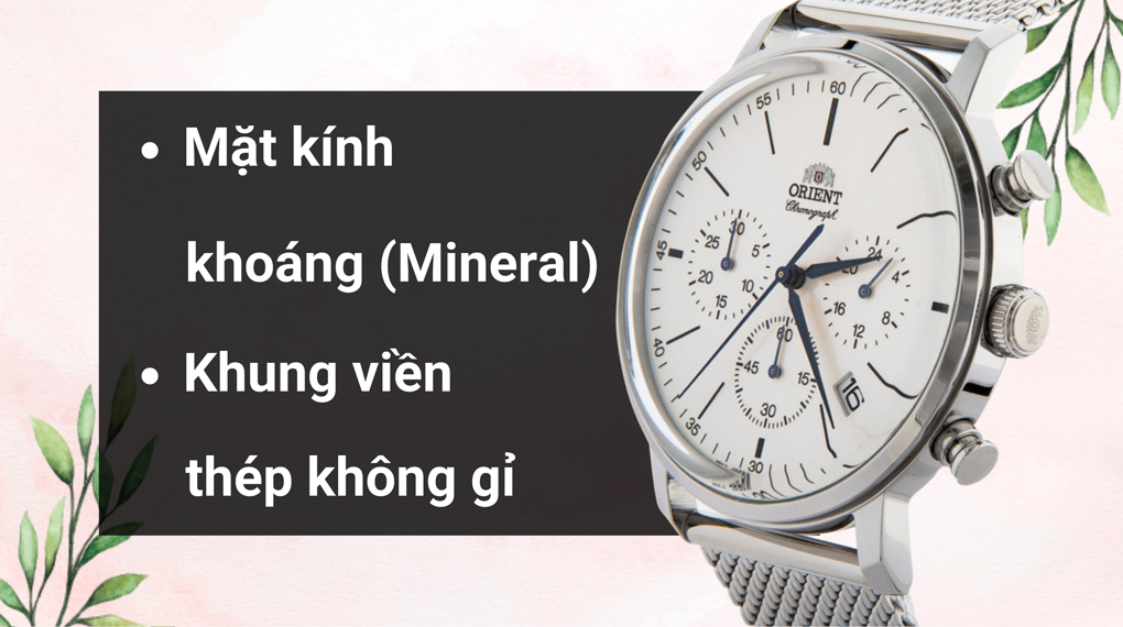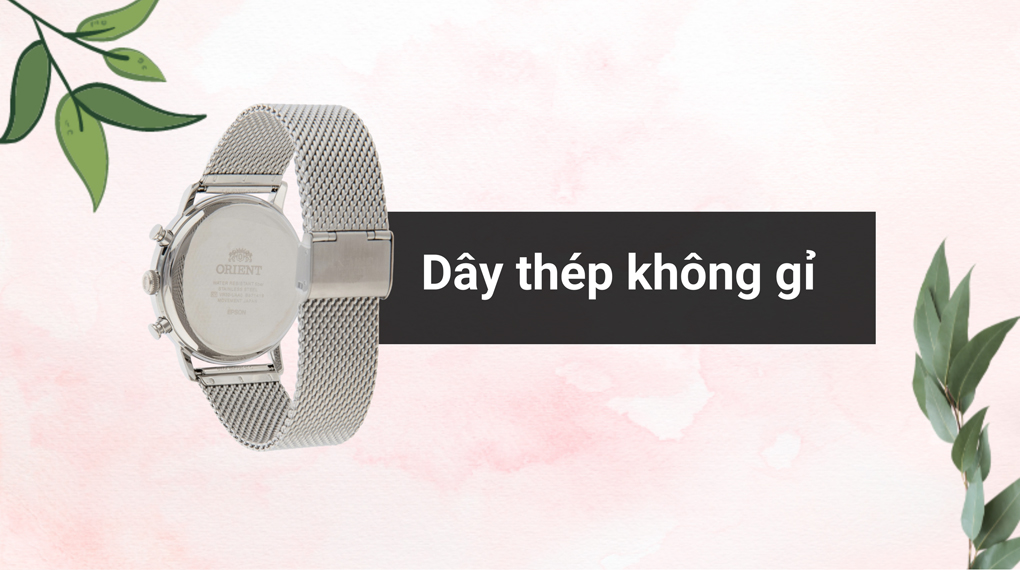 • Thép không gỉ là vật liệu mà thương hiệu Orient tin tưởng trang bị cho khung viền và dây đeo vừa giúp nâng tầm sang trọng của mẫu mã lại vừa bền bỉ, hạn chế ăn mòn trước tác động từ môi trường.