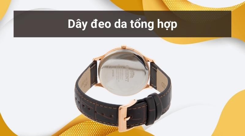 - Dây làm bằng chất liệu da tổng hợp nên tạo cảm giác thoáng mát, mát mẻ trong ngày dài, dễ lau chùi và độ bền cao. Khung viền làm bằng thép không gỉ 316L mạ PVD có độ bền cao, chống ăn mòn, sáng bóng.