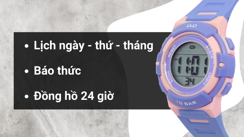 - Được trang bị nhiều chức năng hữu ích như: Bấm giờ thể thao, múi giờ thứ 2, báo thức, đèn nền, lịch thứ, ngày, tháng và đồng hồ định dạng 24 giờ