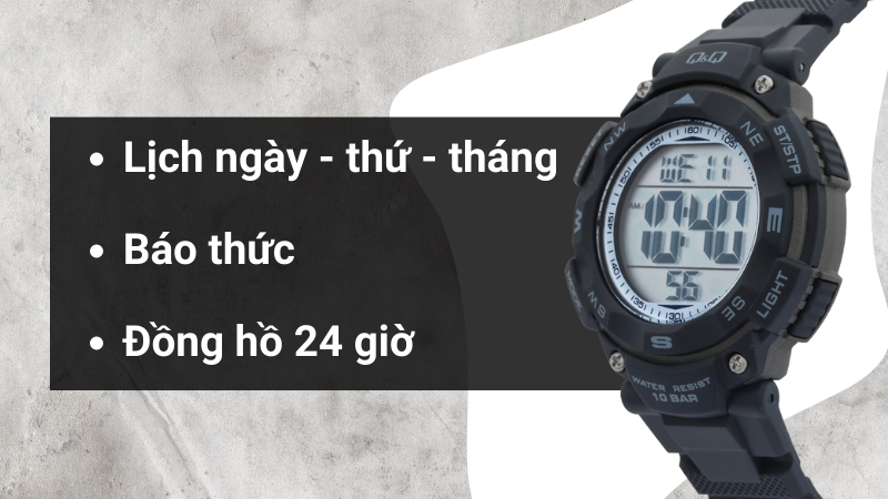 - Đồng hồ được tích hợp nhiều tiện ích như: Bấm giờ thể thao, báo thức, đèn nền, lịch thứ, lịch ngày, lịch tháng và múi giờ thứ 2