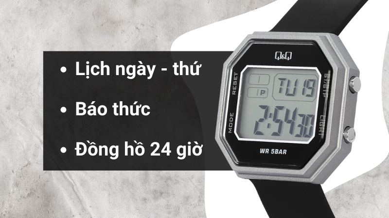 - Đồng hồ hỗ trợ báo thức, bấm giờ thể thao, lịch ngày, lịch thứ, múi giờ thứ hai, đèn nền và đồng hồ 24h