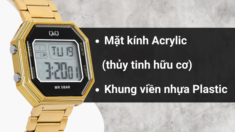 - Khung viền được chế tác từ nhựa plastic, bảo vệ an toàn cho các chi tiết bên trong đồng hồ. Dây đeo làm từ thép không gỉ bền bỉ, sáng bóng, mát tay khi đeo.