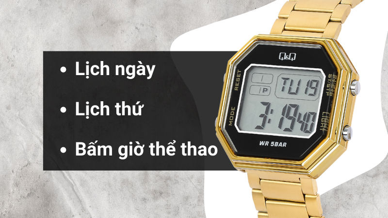 - Đồng hồ hỗ trợ lịch thứ, lịch ngày, đèn nền, báo thức và bấm giờ thể thao giúp người dùng chủ động theo dõi thời gian.