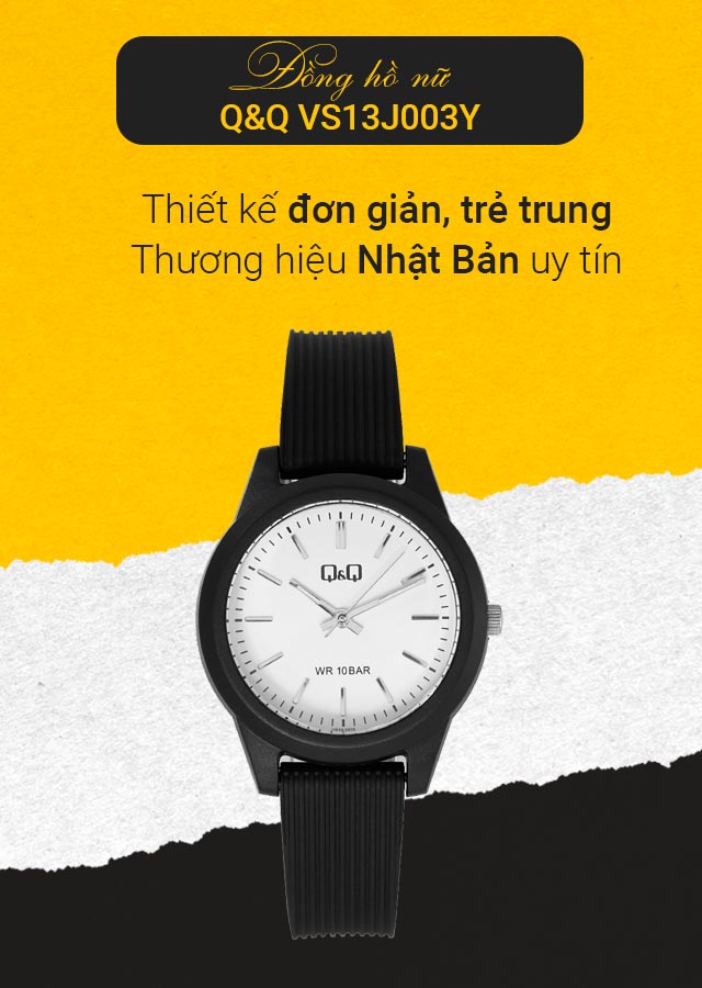 Đồng hồ nữ Q&Q VS13J003Y đeo trên tayTổng quan về đồng hồ nữ Q&Q VS13J003Y Đồng hồ nữ Q&Q VS13J003Y có mặt kính khoáng trong suốtĐồng hồ nữ Q&Q VS13J003Y có độ dày mặt 10 mmĐồng hồ nữ Q&Q VS13J003Y có khung viền cứng cápĐồng hồ nữ Q&Q VS13J003Y có dây đeo nhựa nhẹ nhàngĐồng hồ nữ Q&Q VS13J003Y có chỉ số chống nước 10 ATM