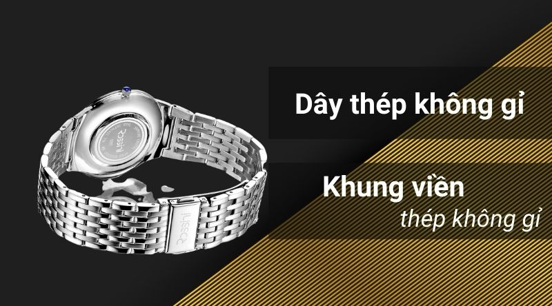 - Thép không gỉ là chất liệu của khung viền và dây đeo, chất liệu này có độ cứng cao, bền bỉ, có khả năng chống ăn mòn tốt và chống oxi hoá.