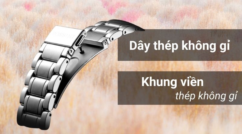 - Khung viền và dây đeo đều được làm từ thép không gỉ. Chất liệu này có độ cứng cao, bền bỉ, có khả năng chống ăn mòn tốt, chống oxi hoá, chống chịu mọi thời tiết.
