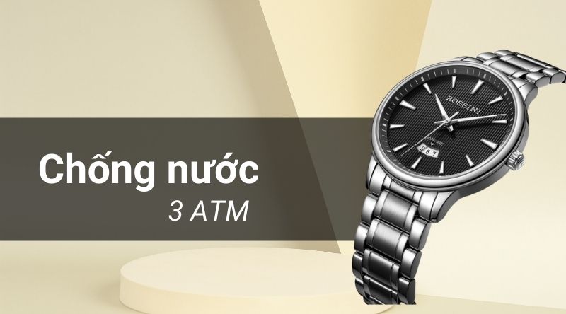 - Hệ số kháng nước của mẫu đồng hồ nam này là 3 ATM, có thể đi mưa và rửa tay. Lưu ý không sử dụng khi đi tắm, đi bơi, lặn.