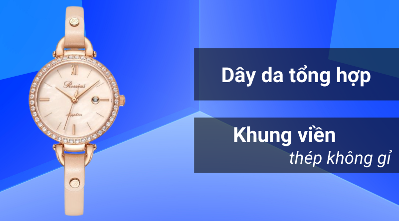- Chất liệu của khung viền được làm từ chất liệu thép không gỉ có độ cứng cao, bền bỉ và chống ăn mòn tốt. Dây đeo được làm từ da tổng hợp đem đến cảm giác thoải mái khi đeo, ôm trọn cổ tay người dùng.