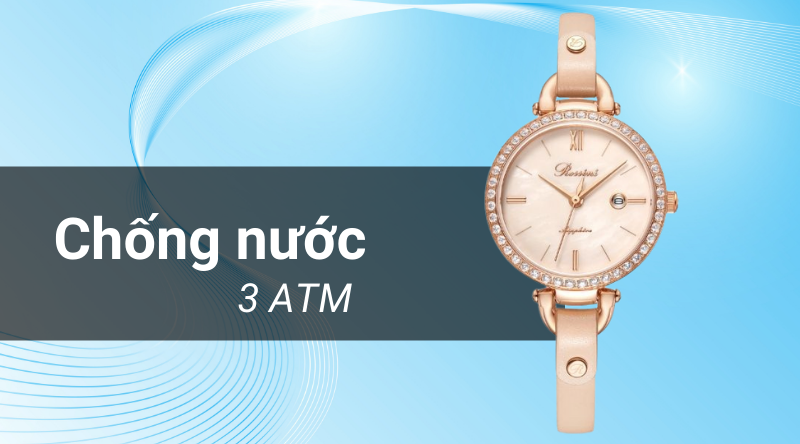 - Khả năng chống nước của mẫu đồng hồ nữ này là 3 ATM có thể đi mưa, rửa tay. Lưu ý không sử dụng khi đi tắm, đi bơi, lặn.