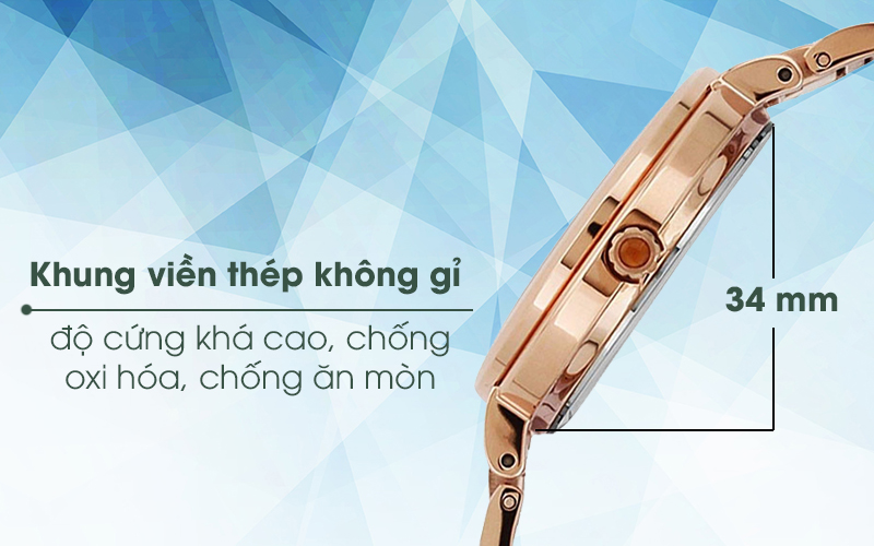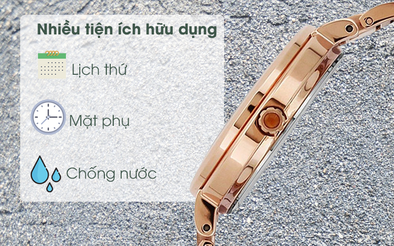 Thiết kế và gia công kĩ lưỡng giúp mẫu đồng hồ quartz này có khả năng chống chịu được áp suất nước lên đến 5 ATM, đem đến sự yên tâm khi mang dưới trời mưa hay rửa mặt.