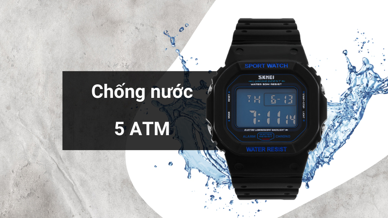 - Chỉ số chống nước 5 ATM: An toàn khi bé đeo đồng hồ đi tắm, đi mưa, không mang khi bơi, lặn