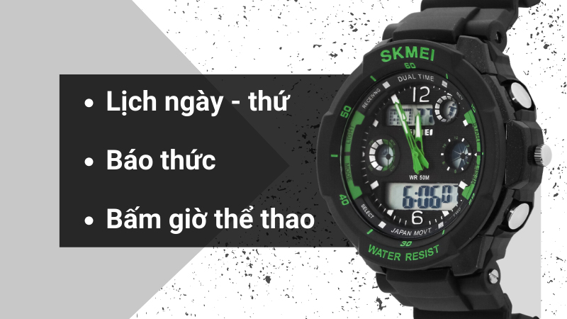 • Chiếc đồng hồ Skmei này còn hỗ trợ thêm nhiều tiện ích thú vị như: Lịch thứ, lịch ngày, báo thức, bấm giờ thể thao, múi giờ thứ hai giúp các bé theo dõi thời gian thuận tiện.