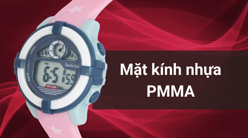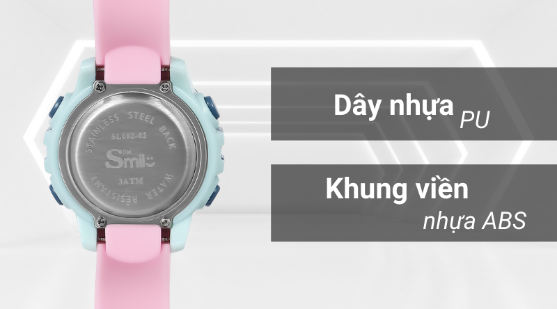 - Đồng hồ Smile Kid được trang bị khung viền làm từ nhựa ABS và dây đeo cũng được làm từ chất liệu nhựa PU không chỉ đem đến độ bền tối ưu, mà còn mang lại cảm giác thoải mái khi đeo. Mặt kính của đồng hồ được làm từ nhựa PMMA có khả năng chịu lực tốt, khó vỡ.