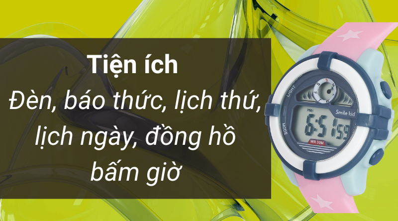 - Đem đến nhiều trải nghiệm tuyệt vời hơn cho trẻ với các tính năng vượt trội như lịch thứ, lịch ngày, báo thức và bấm giờ được trang bị ngay trên mặt đồng hồ vô cùng tiện ích. Bên cạnh đó còn có đèn nền giúp bé có thể quan sát thời gian ngay cả khi trong bóng tối.