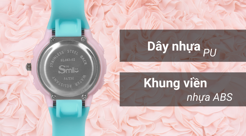 - Đồng hồ Smile Kid được trang bị khung viền làm từ nhựa ABS và dây đeo cũng được làm từ chất liệu nhựa không chỉ đem đến độ bền tối ưu, mà còn mang lại cảm giác thoải mái khi đeo.