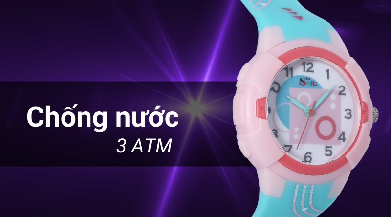 - Đồng hồ có hệ số chống nước lên đến 3 ATM, các bé có thể thoải mái đeo khi rửa tay, đi mưa. Lưu ý: không đeo khi đi tắm, bơi lội hoặc lặn.