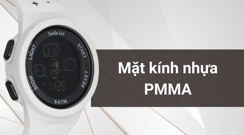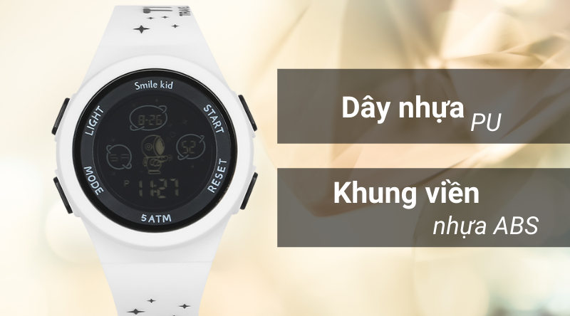 - Đồng hồ Smile Kid được trang bị khung viền làm từ nhựa ABS và dây đeo cũng được làm từ chất liệu nhựa không chỉ đem đến độ bền tối ưu, mà còn mang lại cảm giác thoải mái khi đeo. Mặt kính được làm từ nhựa PMMA có khả năng chịu lực tốt, khó vỡ.