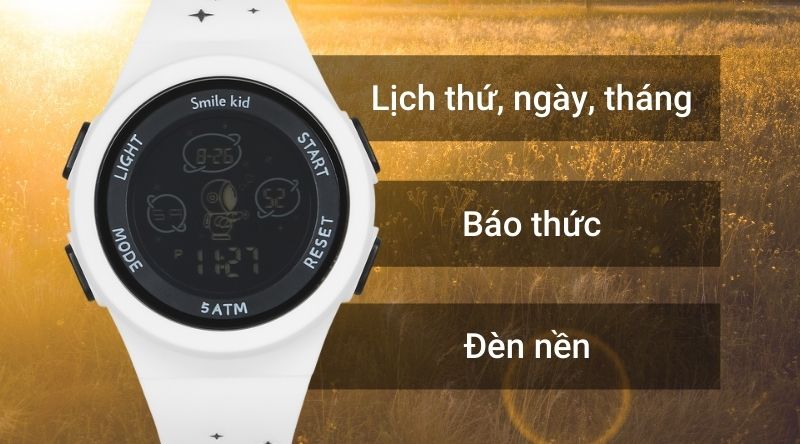 - Tích hợp nhiều tính năng hữu ích như lịch thứ, ngày, tháng, báo thức hỗ trợ trẻ tối đa trong việc theo dõi thời gian. Ngoài ra, đèn nền giúp trẻ có thể quan sát rõ các chỉ số trong điều kiện thiếu ánh sáng.