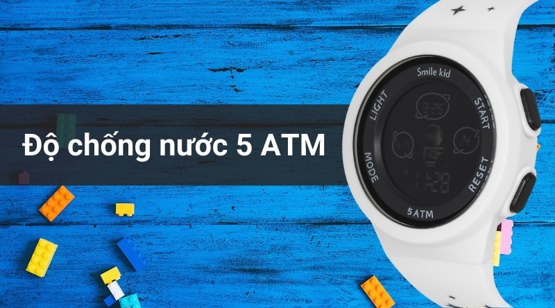 - Hệ số chống nước của mẫu đồng hồ trẻ em này là 5 ATM, có thể cho bé sử dụng khi rửa tay và đi mưa, đi tắm. Lưu ý: không sử dụng khi đi bơi, lặn.