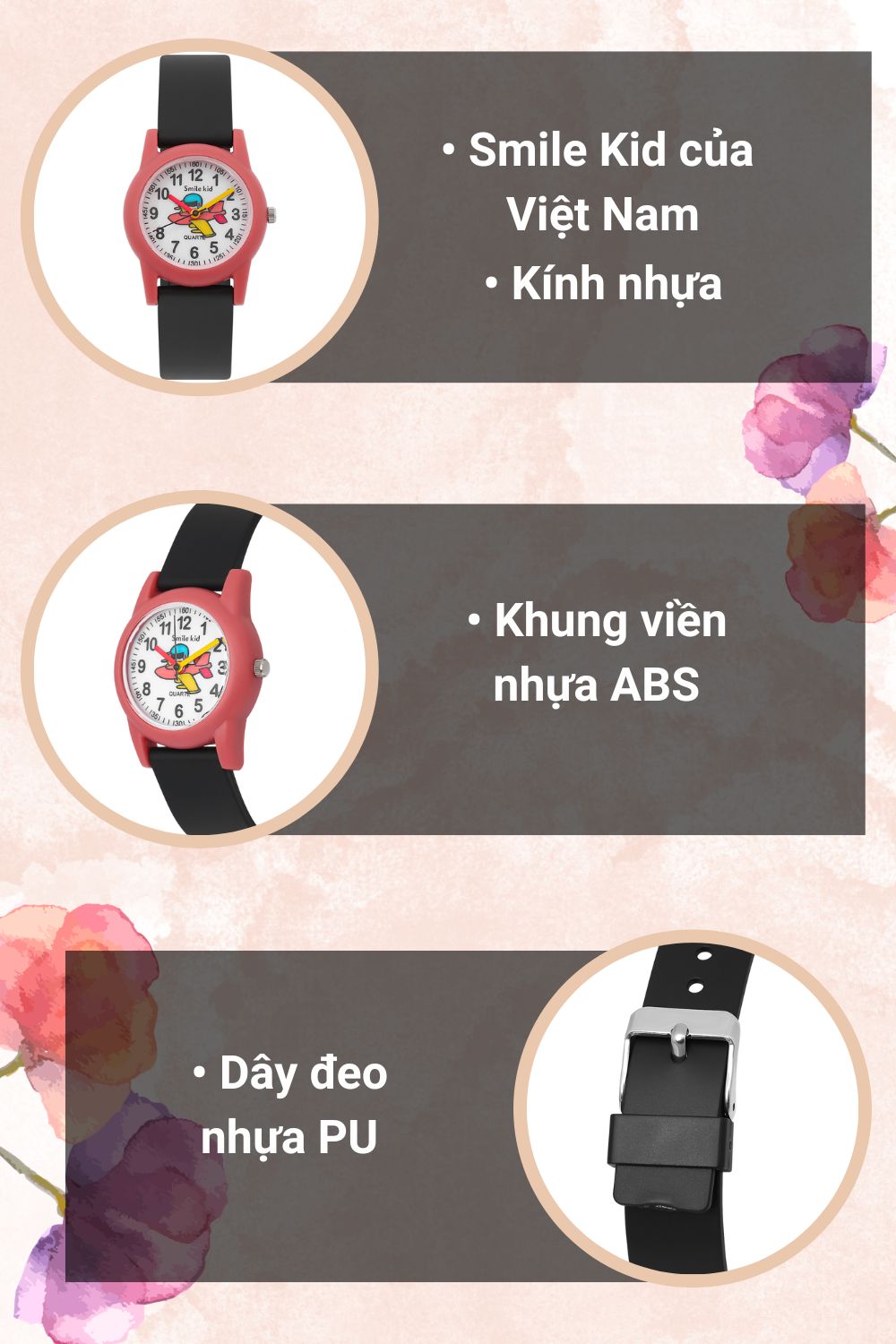 - Đồng hồ Smile Kid với kiểu dáng, mẫu mã năng động, dễ thương phù hợp cho các em nhỏ, đồng thời đồng hồ Smile Kid còn là bạn đồng hành cùng các bé khi đến trường.
