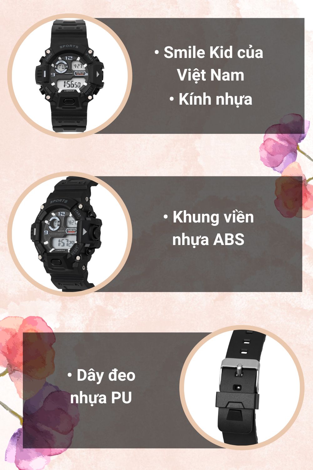 • Đồng hồ Smile Kid được trang bị khung viền làm từ nhựa ABS và dây đeo cũng được làm từ chất liệu nhựa PU không chỉ đem đến độ bền tối ưu, mà còn mang lại cảm giác thoải mái khi đeo.
