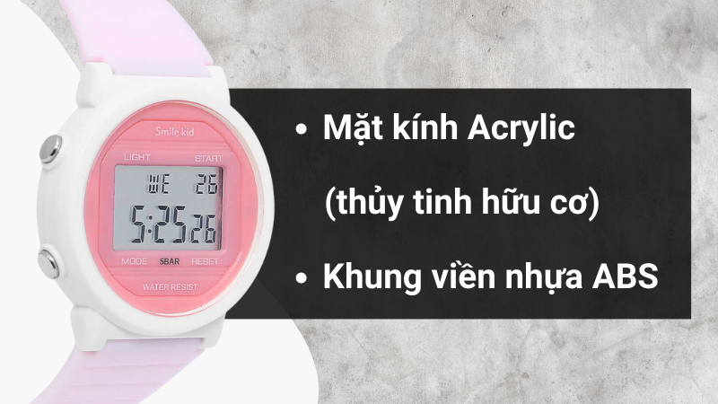 - Đồng hồ Smile Kid được trang bị khung viền nhựa ABS chắc chắn đem đến độ bền tối đa cho đồng hồ, bởi khả năng chịu va đập cực kì tốt. Thêm vào đó, trọng lượng nhẹ sẽ giúp trẻ không cảm thấy khó chịu khi đeo cả ngày dài.