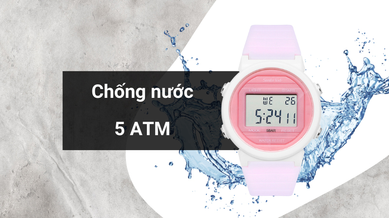 - Hệ số chống nước lên đến 5 ATM giúp các bậc phụ huynh không còn lo sợ nước sẽ gây ảnh hưởng đến đồng hồ khi trẻ đeo rửa tay, đi mưa hoặc đi tắm. Lưu ý: không đeo khi đi bơi lội, lặn.