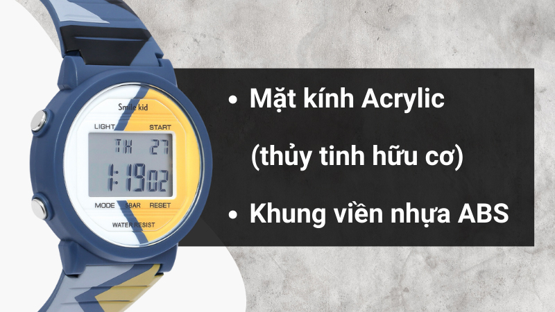 - Đồng hồ Smile Kid được trang bị khung viền chắc chắn làm từ nhựa ABS cứng cáp, có khả năng chịu lực tối ưu giúp duy trì tuổi thọ lâu dài cho đồng hồ.