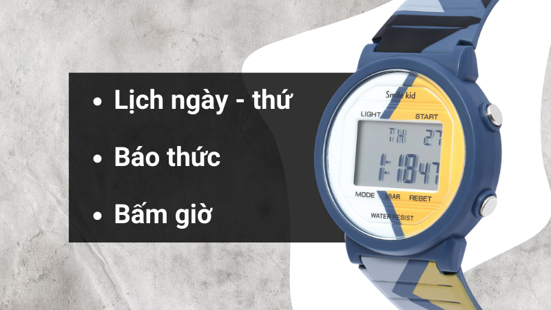 - Đồng hồ mang đến nhiều tính năng đa dạng vô cùng tiện ích cho trẻ như lịch thứ, lịch ngày, báo thức và bấm giờ thể thao.