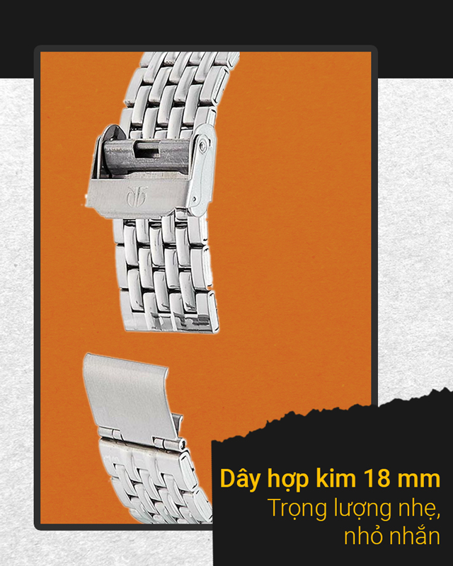- Đồng hồ nam có đường kính mặt 38 mm và độ rộng dây 18 mm.