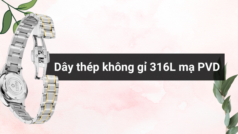 • Dây đeo và khung viền được làm từ thép không gỉ 316L mạ PVD sáng bóng, chịu va đập tốt, bền đẹp với thời gian.