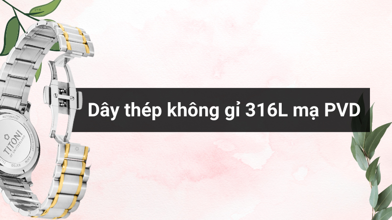 • Dây đeo và khung viền được làm từ thép không gỉ 316L mạ PVD sáng bóng, chịu va đập tốt, bền đẹp với thời gian.