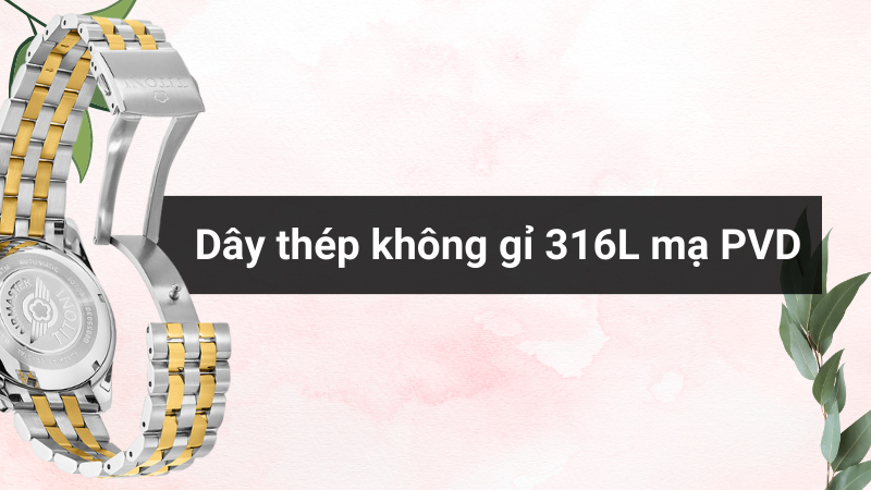 • Khung viền và dây đeo được làm từ thép không gỉ 316L mạ PVD sở hữu độ bền cao, sáng bóng, chống oxy hóa tốt.