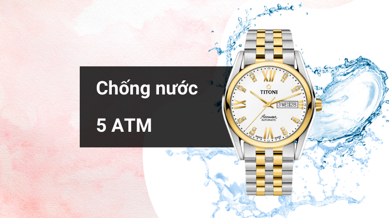 • Độ chống nước của đồng hồ lên tới 5 ATM: Yên tâm đeo đồng hồ khi đi mưa hay đi tắm, không nên mang khi bơi, lặn.