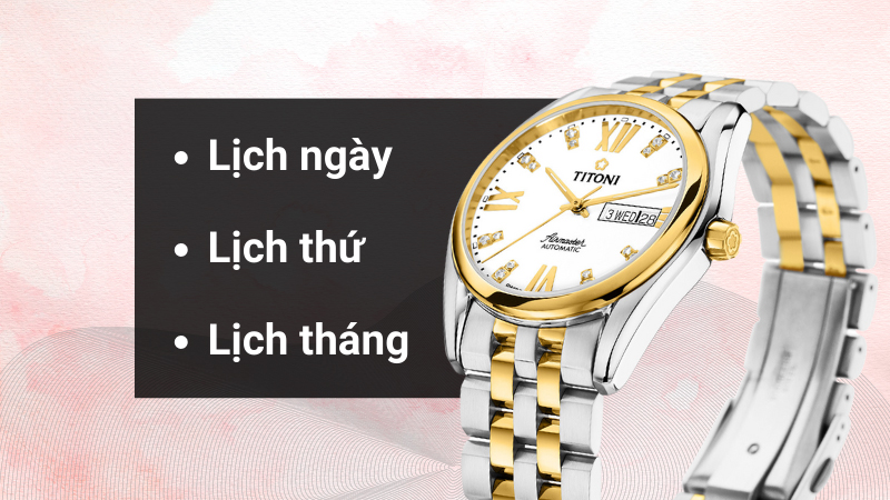 • Đồng hồ được trang bị thêm ô lịch thứ, ngày, tháng ở vị trí 3 giờ, giúp người dùng theo dõi thời gian một cách thuận tiện.