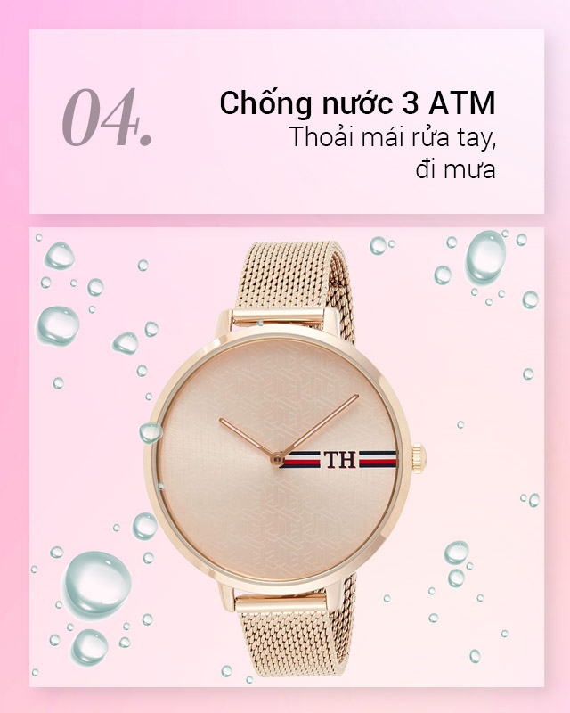 - Độ chống nước 3 ATM cho phép bạn đeo đồng hồ khi đi mưa, rửa tay, không mang khi tắm hay bơi lội