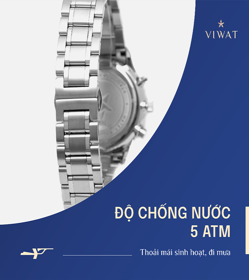 • 5 ATM là hệ số chống nước của chiếc đồng hồ này, giúp người dùng có thể an tâm hơn khi mang đồng hồ theo bên mình khi đi tắm hay đi mưa. Lưu ý: không nên mang đồng hồ khi đi bơi, đi lặn.