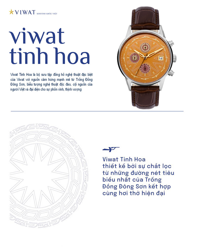 • Trong năm nay, ViWat đã cho ra mắt bộ sưu tập Tinh Hoa, bộ sưu tập được lấy cảm hứng từ các hoạ tiết, hoa văn trống đồng Đông Sơn sở hữu một vẻ ngoài cực kì sang trọng, nổi bật và thu hút bởi sắc vàng cùng hoa văn trên mặt đồng hồ này.