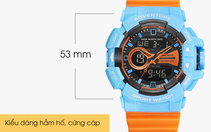 Kích thước mặt của mẫu đồng hồ Weide nam này lớn với đường kính đến 53 mm cho bạn nam có cổ tay to thoải mái mang mà không sợ quá nhỏ.