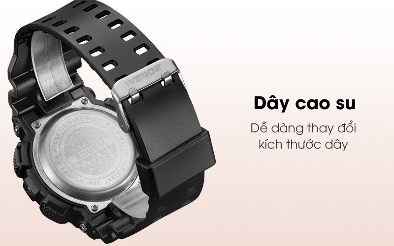 Với dạng khóa cài lỗ, bạn có thể dễ dàng điều chỉnh độ rộng dây sao cho phù hợp và thoải mái nhất khi đeo. Dây đeo của mẫu đồng hồ Weide nam này với chất liệu cao su cũng cho trọng lượng nhẹ nhàng, cảm giác dễ chịu khi đeo cả ngày dài.