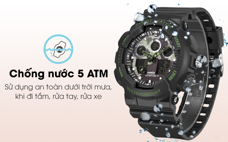 Chuẩn chống nước 5 ATM được Weide trang bị sẽ bảo vệ đồng hồ an toàn khi vô tình bị tác động từ nước.