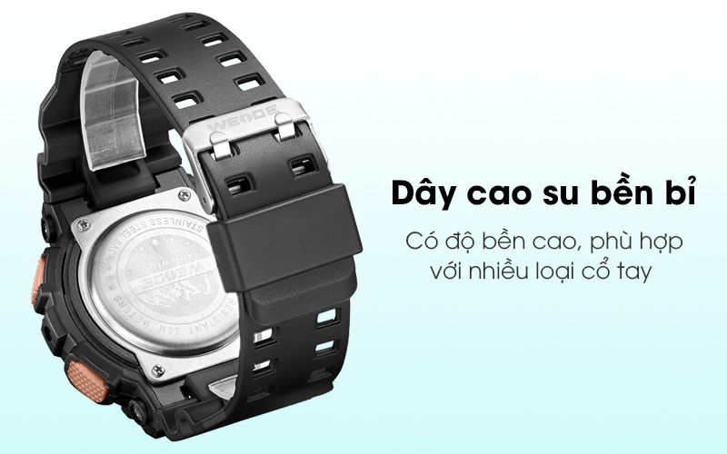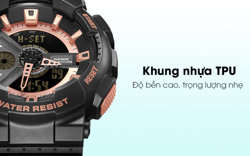 Khung nhựa của đồng hồ Weide mang những ưu điểm của nhựa TPU như nhẹ, an toàn cho môi trường và sức khỏe, có độ bền cao.